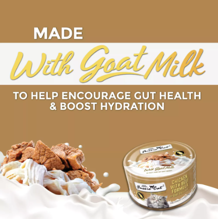 Water Sufficient for Processing, Chicken, Beef, Goat Milk, Sunflower Seed Oil, Tapioca Starch, Tricalcium Phosphate, Tuna Oil, Xanthan Gum, Calcium Carbonate, Choline Chloride, Taurine, Zinc Sulfate, Guar Gum, Fructooligosaccharide, Vitamin C Supplement, Vitamin E Supplement, Ferrous Sulfate, Thiamine Mononitrate, Nicotinic Acid, Calcium Pantothenate, Vitamin A Supplement, Manganese Sulfate, Copper Sulfate, Riboflavin Supplement, Pyridoxine Hydrochloride, Folic Acid, Potassium Iodide, Vitamin D3 Supplement, Biotin, Vitamin B12 Supplement.