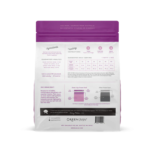 Ingredients: Goat heart, goat (with bone), goat liver, goat kidney, organic parsley, organic kelp, vitamin E supplement.