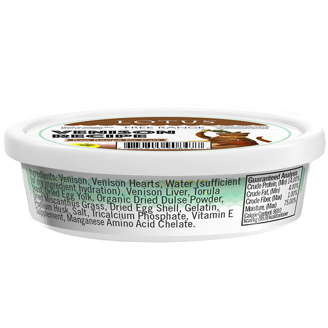 Venison, Venison Hearts, Water sufficient for dry ingredient hydration, Venison Liver, Torula Yeast, Dried Egg Yolk, Organic Dried Dulse Powder, Dried Mis canthus Grass, Dried Egg Shell, Gelatin, Psyllium Husk, Salt, Tricalcium Phosphate, Vitamin E Supplement, Maganese Amino Acid Chelate