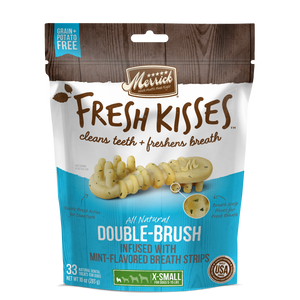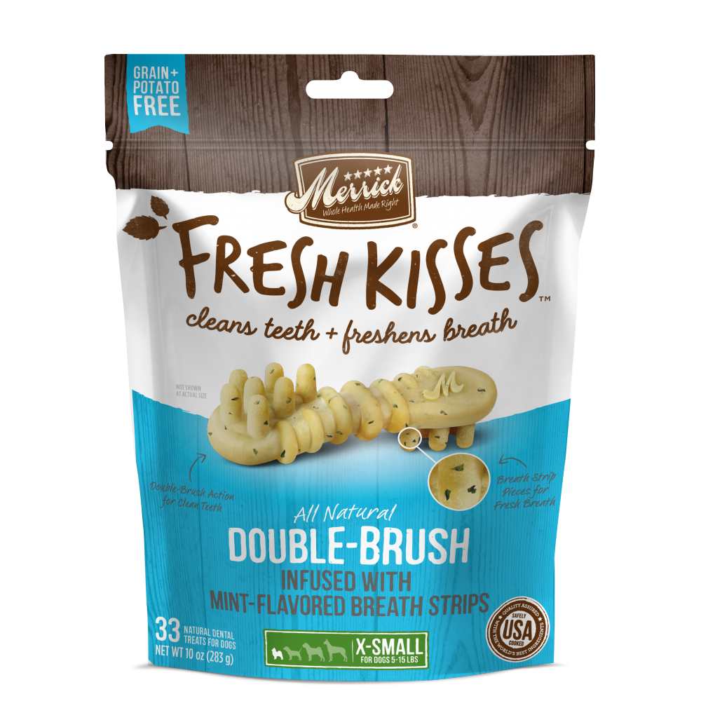 Close cuddles and sweet smooches with your Best Dog Ever just got better with new Merrick Fresh Kisses, an innovative natural dental treat designed not only to clean dog’s teeth, but to freshen breath at the same time. While many dental treats effectively reduce plaque and tartar, until now limited options have been available to also freshen breath. Merrick Fresh Kisses do both. The dental treats feature a double-brush design to clean teeth by removing plaque and tartar during the chewing action of the treat. The treats also are made with natural ingredients specially formulated to freshen breath. Merrick Fresh Kisses are the only dental treat to be both grain-free and potato-free. They are made with all-natural ingredients.