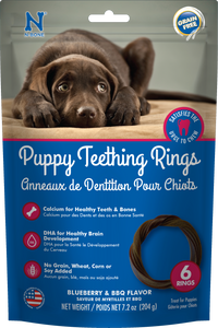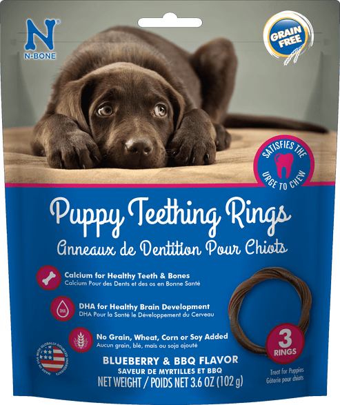 N-Bone® Puppy Teething Rings Grain-Free are easy for floppy puppy paws to hold onto and provide a soothing and appropriate outlet for chewing. Formulated with DHA and calcium to support your puppy’s unique nutritional needs, our delicious grain-free blueberry & bbq flavored rings are pliable and won’t damage immature teeth or upset tummies that have gluten sensitivity.