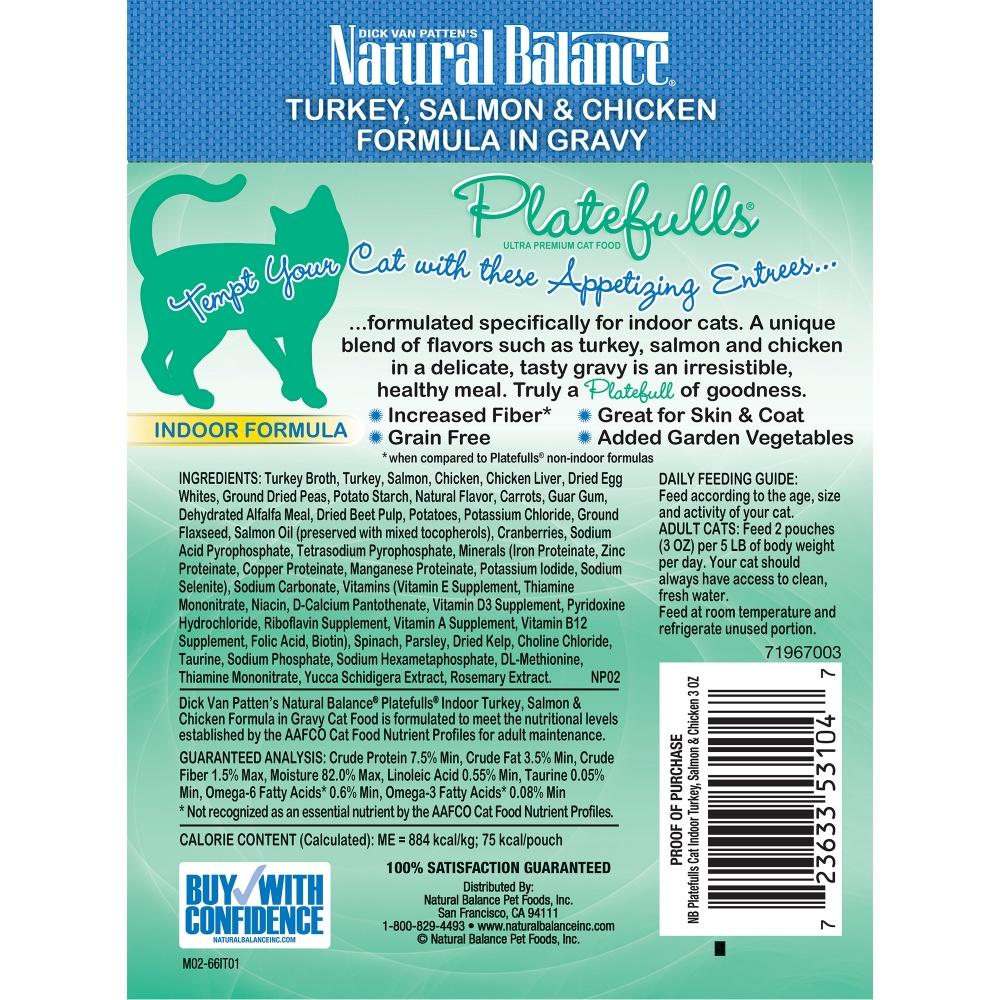 Natural Balance Platefulls Indoor Grain-free Turkey Salmon and Chicken in Gravy Pouch Wet Cat Food provides complete and balanced nutrition for your indoor cat. This grain free recipe is made with high quality protein including turkey, salmon and chicken paired with produce like potatoes and carrots. Natural Balance Platefulls Indoor Grain-free Turkey Salmon and Chicken in Gravy Pouch Wet Cat Food contains no corn, wheat, soy or by-products and has absolutely no artificial colors, flavors, or preservatives! Served in a delicious gravy, this recipe is one any cat is sure to love!