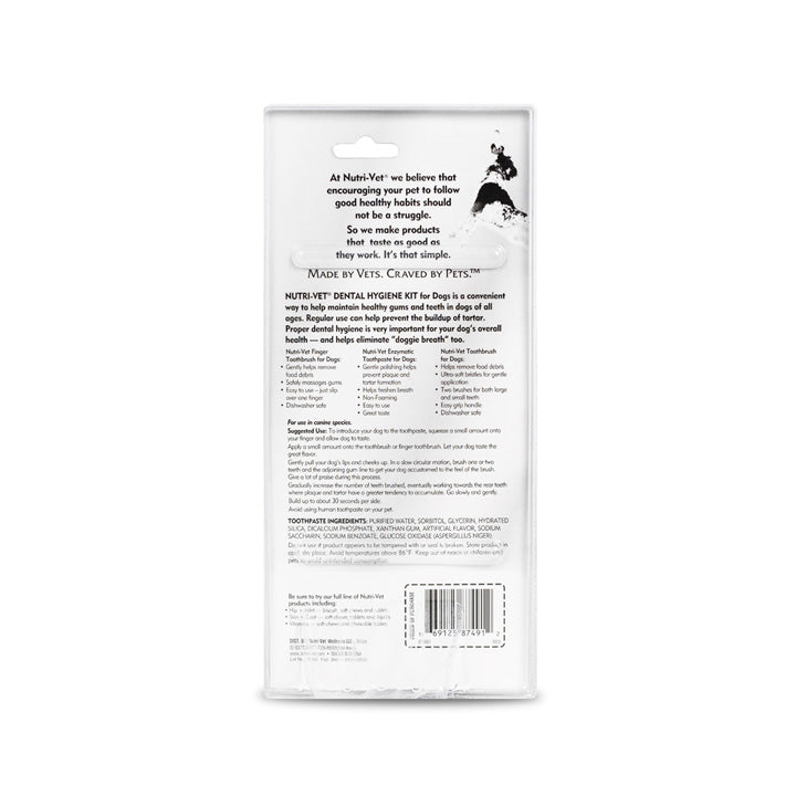 Nutri-Vet Dental Hygiene Kit for dogs gives you the tools you need to maintain a healthy mouth for a healthy dog. The kit contains a dog toothbrush, a finger toothbrush and enzymatic toothpaste. Because regular dog teeth cleaning and dental care is one of the most important things you can do for your pet.