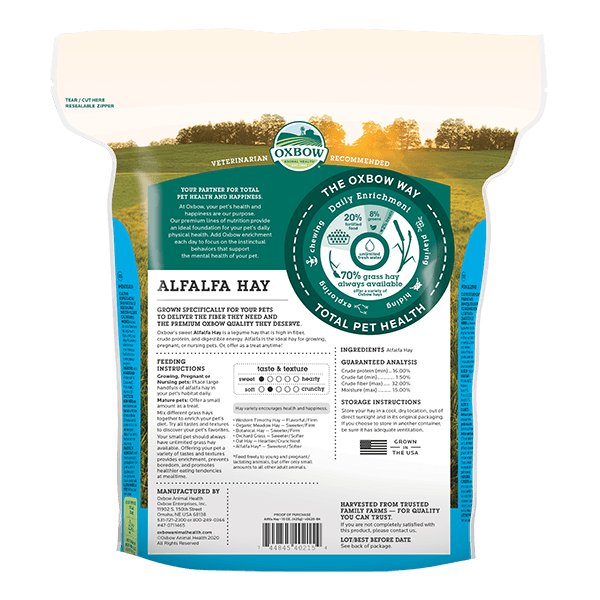 Sweet, soft Oxbow Alfalfa Hay is a legume hay that is high in fiber, protein, and digestible energy. Alfalfa hay is the ideal hay for growing, pregnant, or nursing pets. Or, offer to your rabbit, chinchilla, guinea pig or other small pet as a treat anytime.