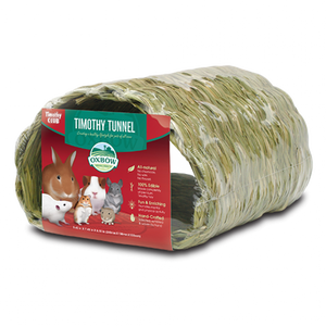 From hideaway to enriching play, the Timothy CLUB Tunnel is the perfect accessory for your small pet. Rabbits, guinea pigs, chinchillas, and every species in between will love this hand-woven, 100% edible accessory. Add various woven hay accessories throughout your small pet’s habitat to provide security, enrichment, and even additional nutrition!