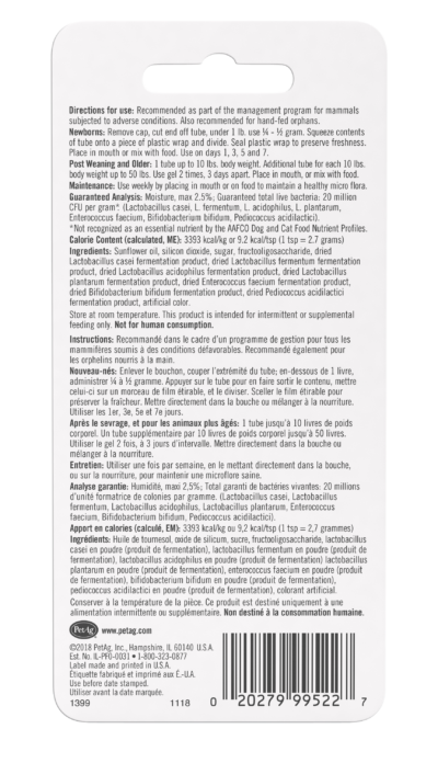 Directions for Use: Newborns: 1/4 to 1/2 gram at birth; 1/2 gram on day 3, 5 and 7 and at weaning. Hand Fed Orphans: increase to 1/2 to 1 gram on days 7, 14 and introduction to solid food. Post Weaning and Older: 1 gram up to 10 lbs. body weight. One additional gram for each 10 lbs. body weight up to 50 lbs. Use gel 2 times, 3 days apart. Place in mouth or mix with food.
